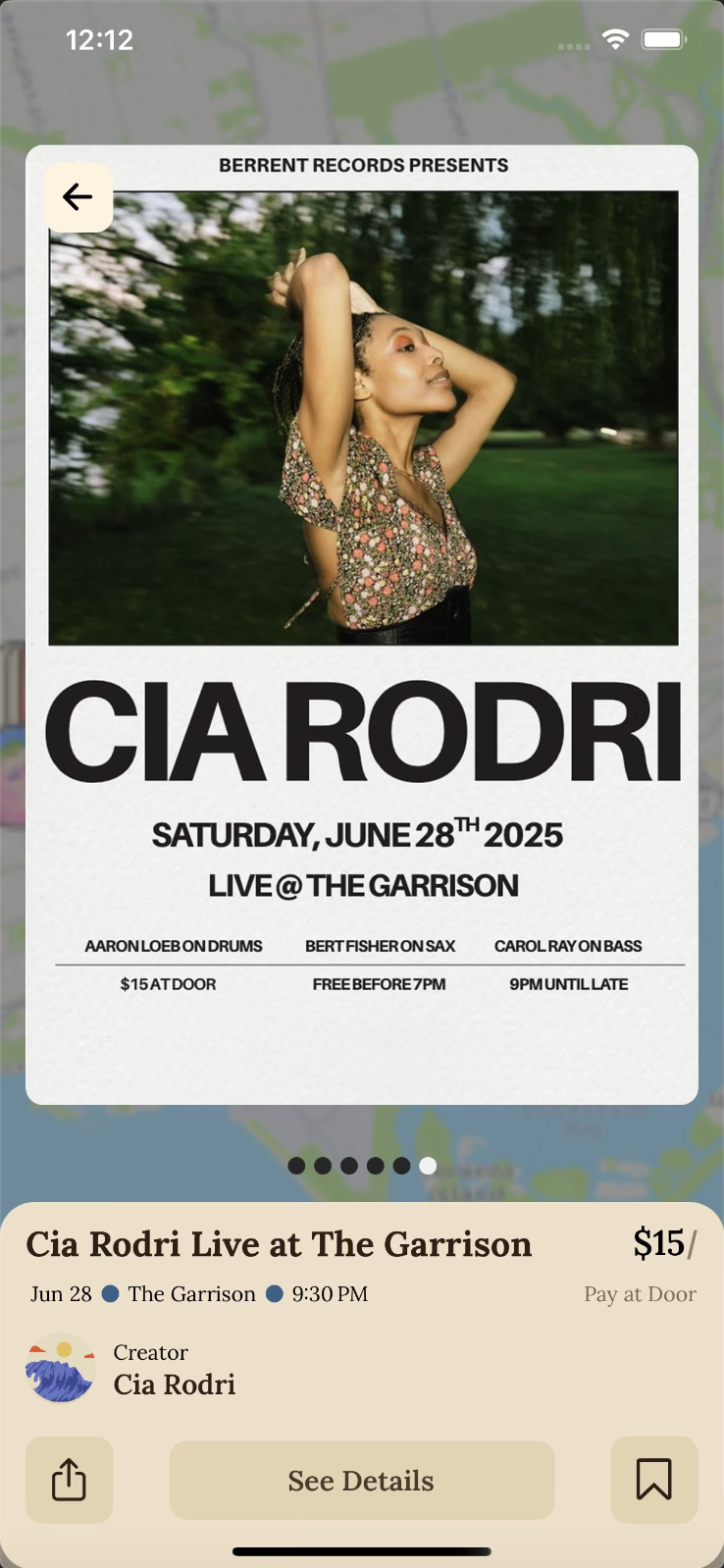 A cross-platform event discovery app for iOS and Android. Users explore nearby events on a live map, follow local creators, and filter by day, price, and distance.