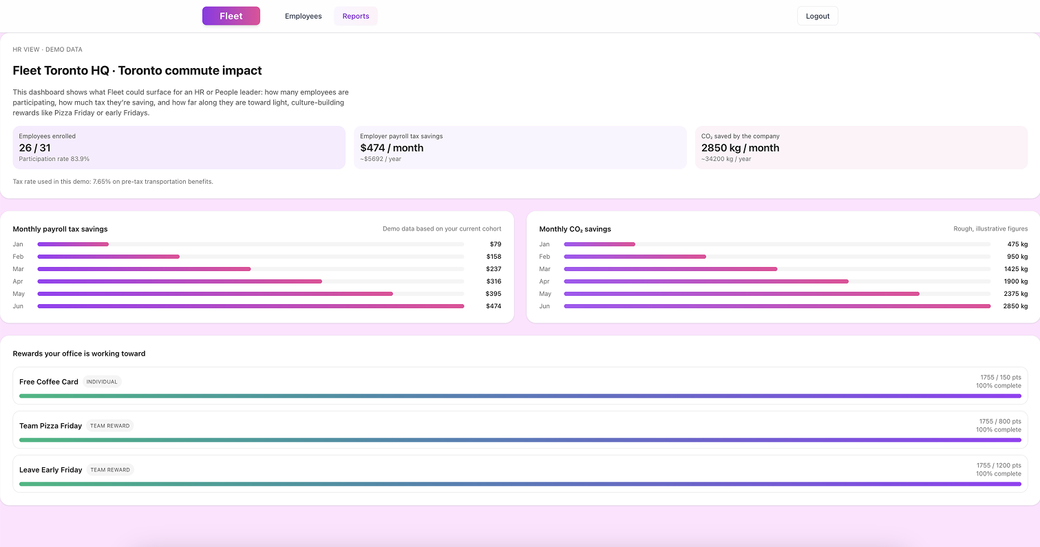 A working demo for a commute benefits platform. Employees pick their commute mode and see real-time CO₂ savings and tax benefits. Team rewards unlock perks like Pizza Friday. Includes a separate HR admin view with payroll analytics and employee management.